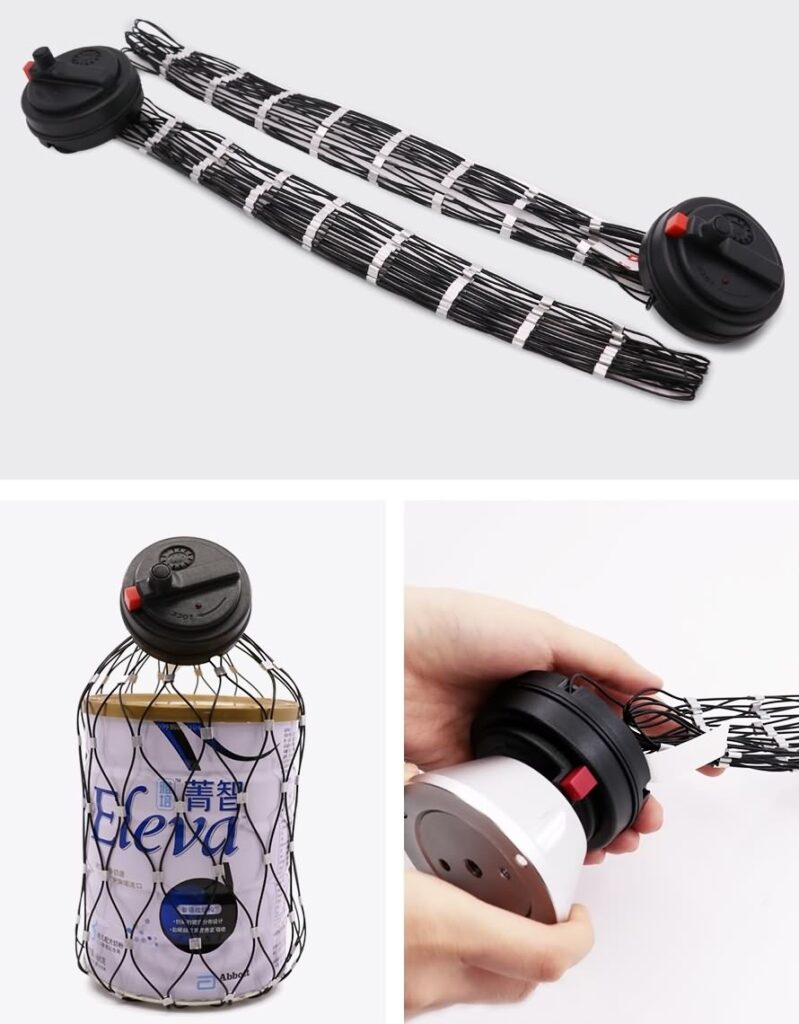 4 air craft cable wires that envelope and cinch down tightly around packagedmerchandise. The spider